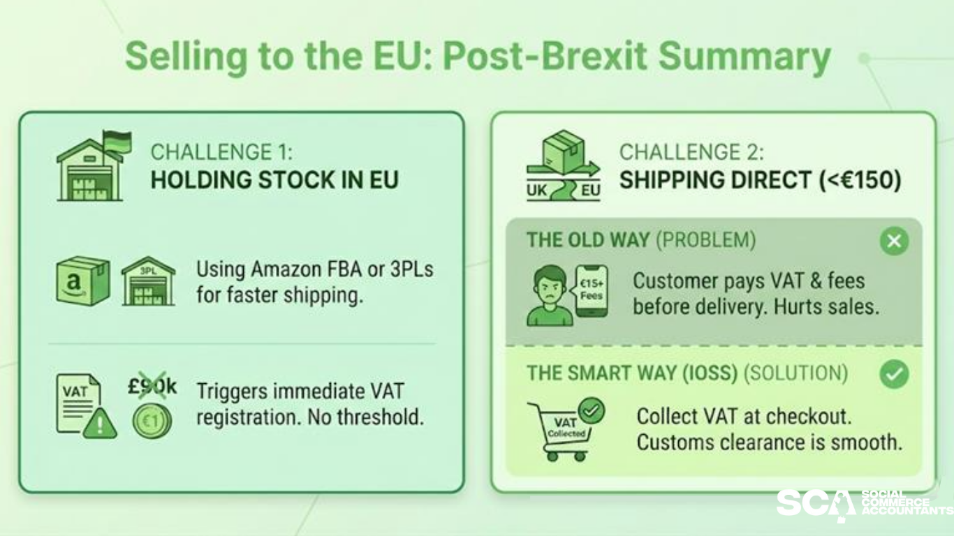 Holding Stock: If you use Amazon FBA in Germany or a 3PL in France to speed up shipping, you usually trigger an immediate need to register for VAT in that country. There is no £90k threshold there—you are liable from the first Euro.
